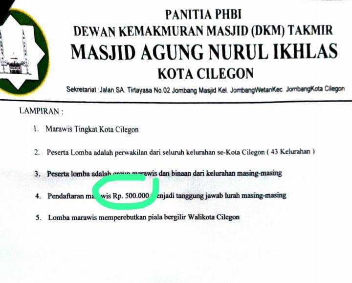 Sekilas, angka itu tampak lumrah untuk sebuah kompetisi. Tetapi jika dikalikan dengan jumlah kelurahan di Kota Cilegon—43 wilayah—potensi dana yang terkumpul bisa mencapai Rp21,5 juta. Angka fantastis untuk sebuah lomba religius yang mestinya berorientasi pada pelestarian seni dakwah, bukan komersialisasi.