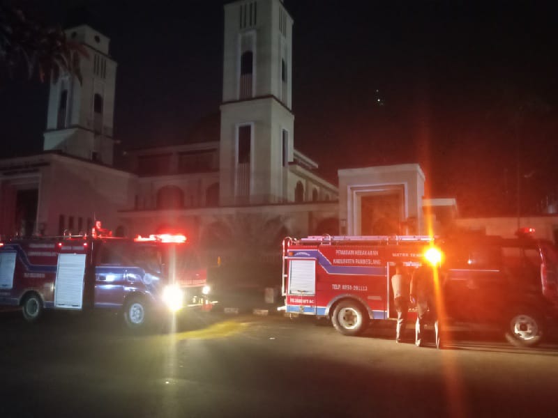 “Saya laporan ke BPBD, setelah listrik tiga kali padam, dikirain gak kuat listrik, dicoba matiin AC, gak taunya ada bau dan percikan api dibelakang masjid agung,” ujar Yunce.