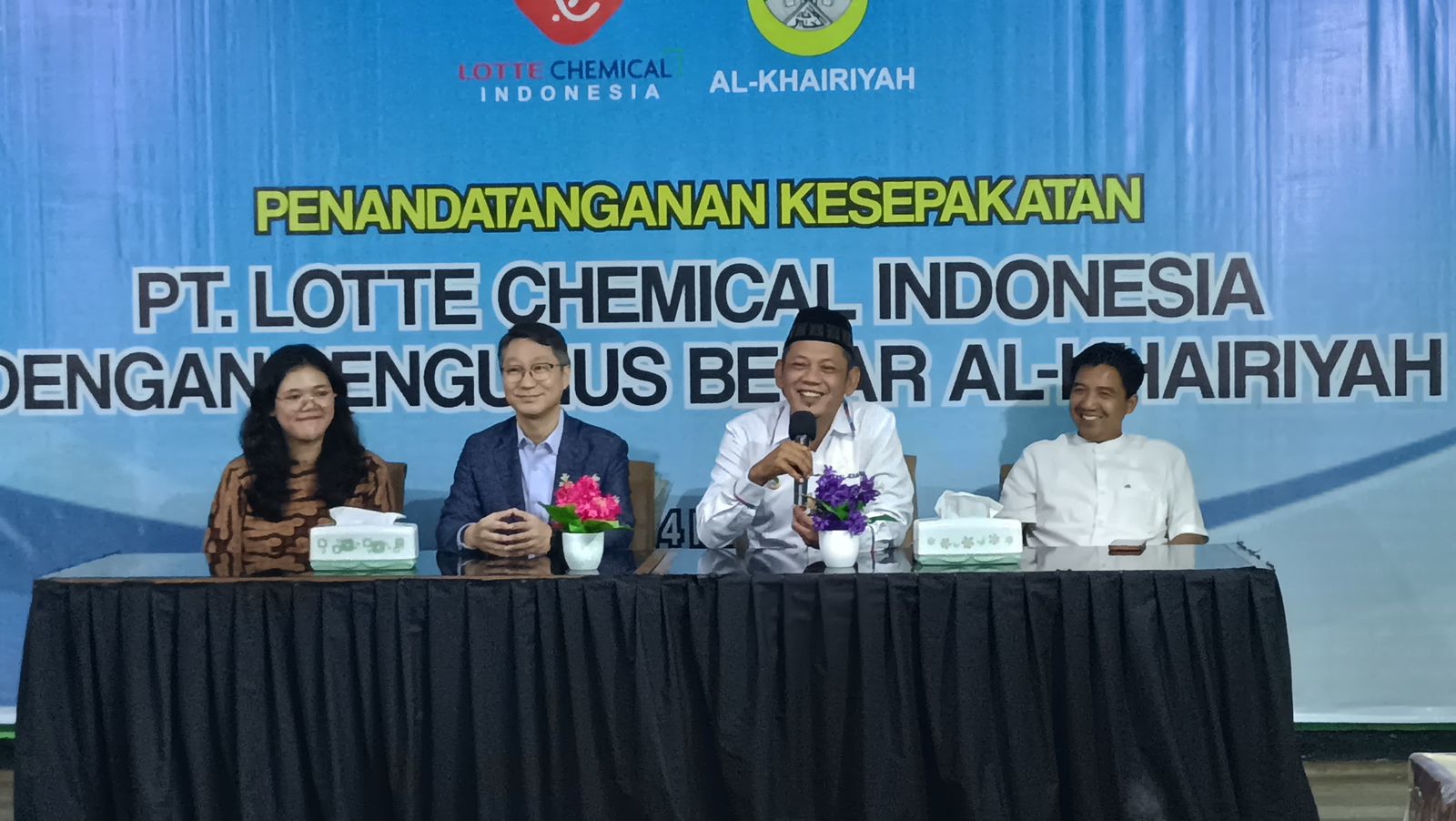 Sementara itu, Mr. Cho Jin Woo sangat mengapresiasi inisiatif Al-Khairiyah dan mengatakan bahwa PT Lotte Chemical Indonesia bermaksud untuk berkontribusi dalam membangun kerja sama industri dan investasi di Indonesia, khususnya di Kota Cilegon. Mr. Cho Jin Woo menyatakan bahwa PT Lotte Chemical Indonesia saat ini sedang membangun pabrik petrokimia dengan nilai investasi mencapai hampir 4 miliar USD yang akan selesai dan memulai produksi pada tahun 2025. PT Lotte Chemical Indonesia senantiasa berharap kontribusi yang diberikan akan meningkatkan neraca perdagangan Indonesia dan membangkitkan kembali perekonomian lokal. Perusahaan juga berkomitmen untuk terus berkontribusi pada kerja sama yang saling bermanfaat untuk masyarakat setempat.